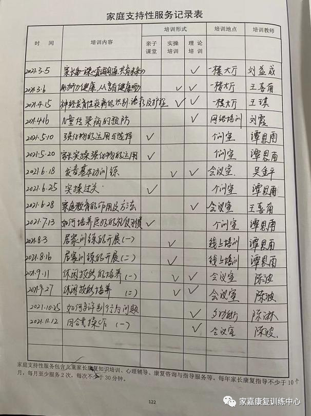 为进一步提高家庭康复的作用,我中心设置有社区康复专员,在家庭康复工作中,我机构根据机构和家长实际情况,制定有家庭指导方案,每周开展一次家庭指导或家长进课堂工作,填写有家庭康复指导记录,并每学期开展一次家访工作。