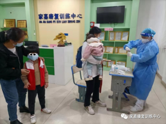 疫情来袭,为了进一步强化疫情防控工作,根据“早发现、早报告 、早隔离、早治疗”的原则,快速掌握教师及孩子的身体健康状况避免传播的风险。核酸检测已成为我们机构防疫工作的常态化。白衣天使、社区志愿者便成为了我们的坚强后盾,他们也是孩子最熟悉的人,更是抗击疫情的榜样和力量。特殊儿童由于认知方面的缺乏,很容易受到周围环境的影响,接受社区常规核酸检测的困难也很多,为此机构请示社区申请核酸检测进机构的支持帮扶,从而也大大的减轻了孩子做核酸的各种困难,为家长省心、省力、省时间。营造良好的防疫环境,健康辅导、心理防“疫”尤为重要,引导孩子认识做核酸检测的重要性,消除儿童对做核酸检测的恐惧感,在老师的引导下做好孩子的心理建设,更高效的接受核酸检测。