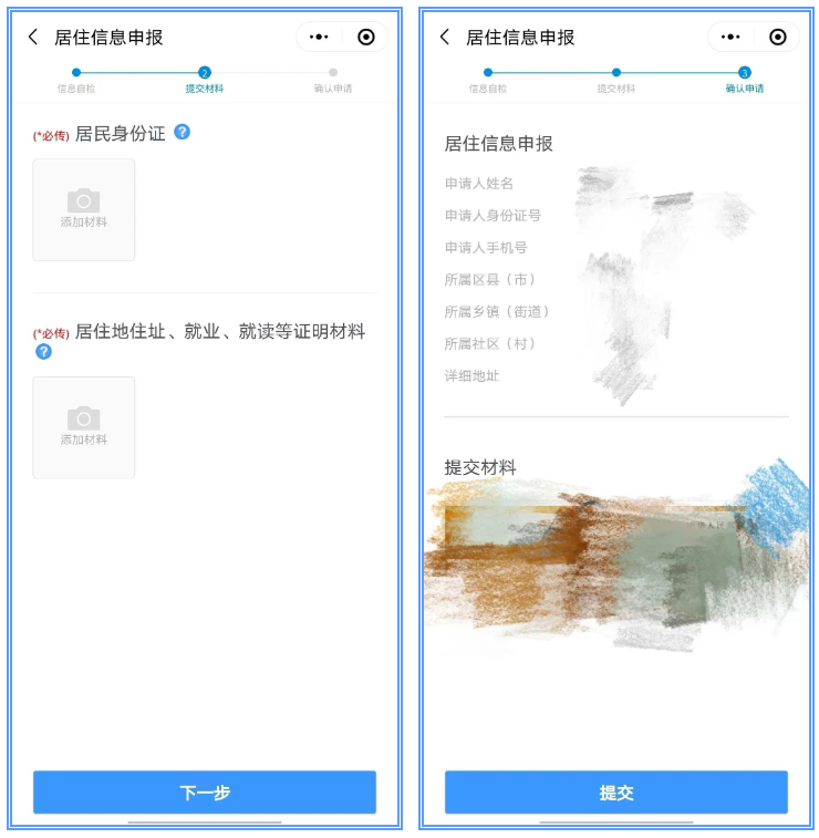第四步:上传居住地证明材料、身份证,提交申报信息即可完成申报。