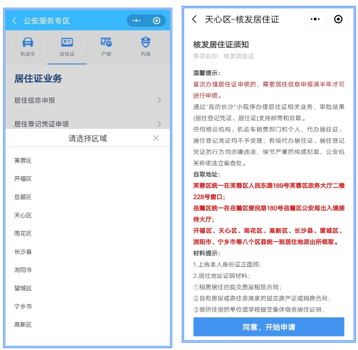 第二步:点击【居住信息申报】,选择办理区域,仔细阅读“居住信息申报须知”后,点击【开始申请】。