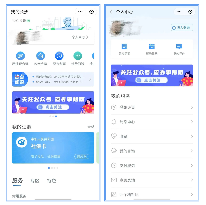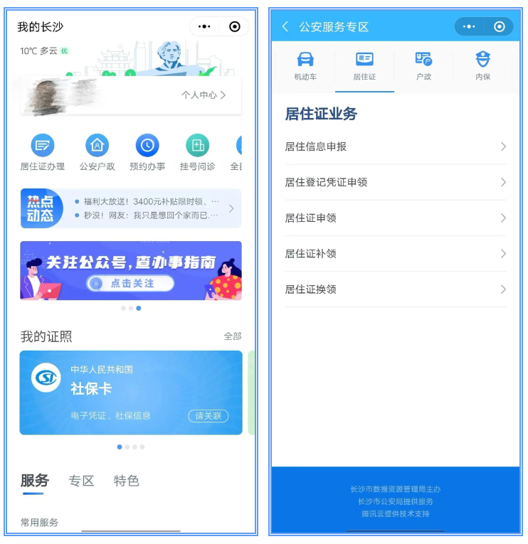 第一步:进入“我的长沙”小程序,在首页点击【居住证办理】,进入公安服务专区后,点击【居住证】业务。